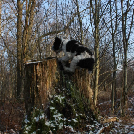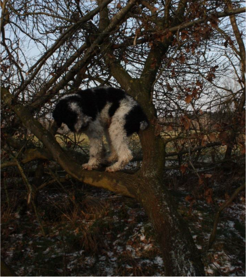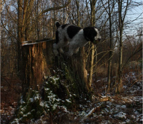de la Casita VerdePerro de Agua EspañolDer Zugang zu meinem AbenteuerspielplatzSitzen war OK, aber ...Action!!! Weiter geht’s, sitzen kann ich auch zu Hause...Hochsitz in Sicht, also Anlauf...... hinauf...einmal die Gegend anschauen... (so tun als ob)Absprung vorbreiten...Weiche, elegante Landung a la Perro!.... und runter!Ein bisschen eng, aber es passt noch...Meine Zweibeiner sagen dazu “Jump”. Macht total viel Spaß!